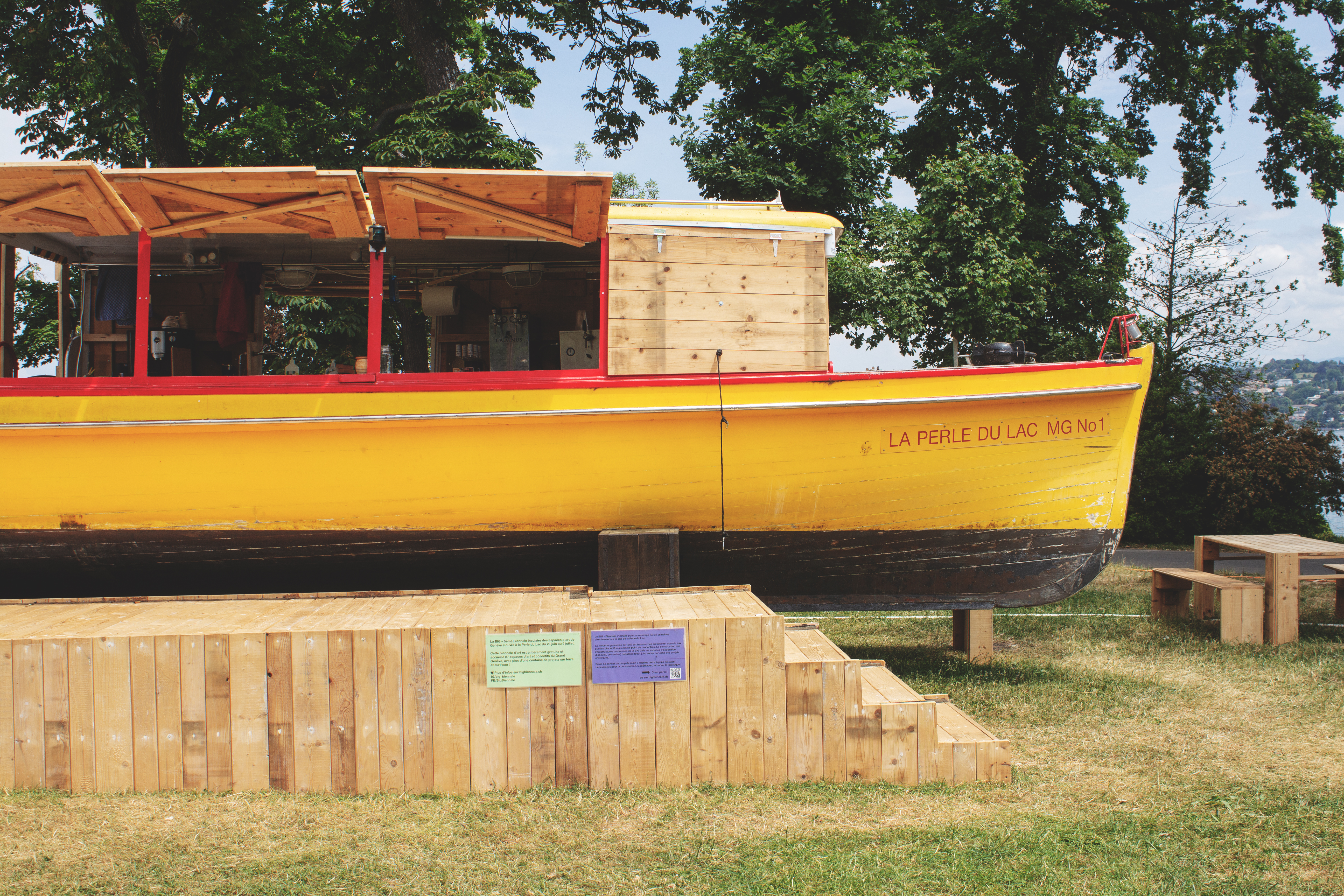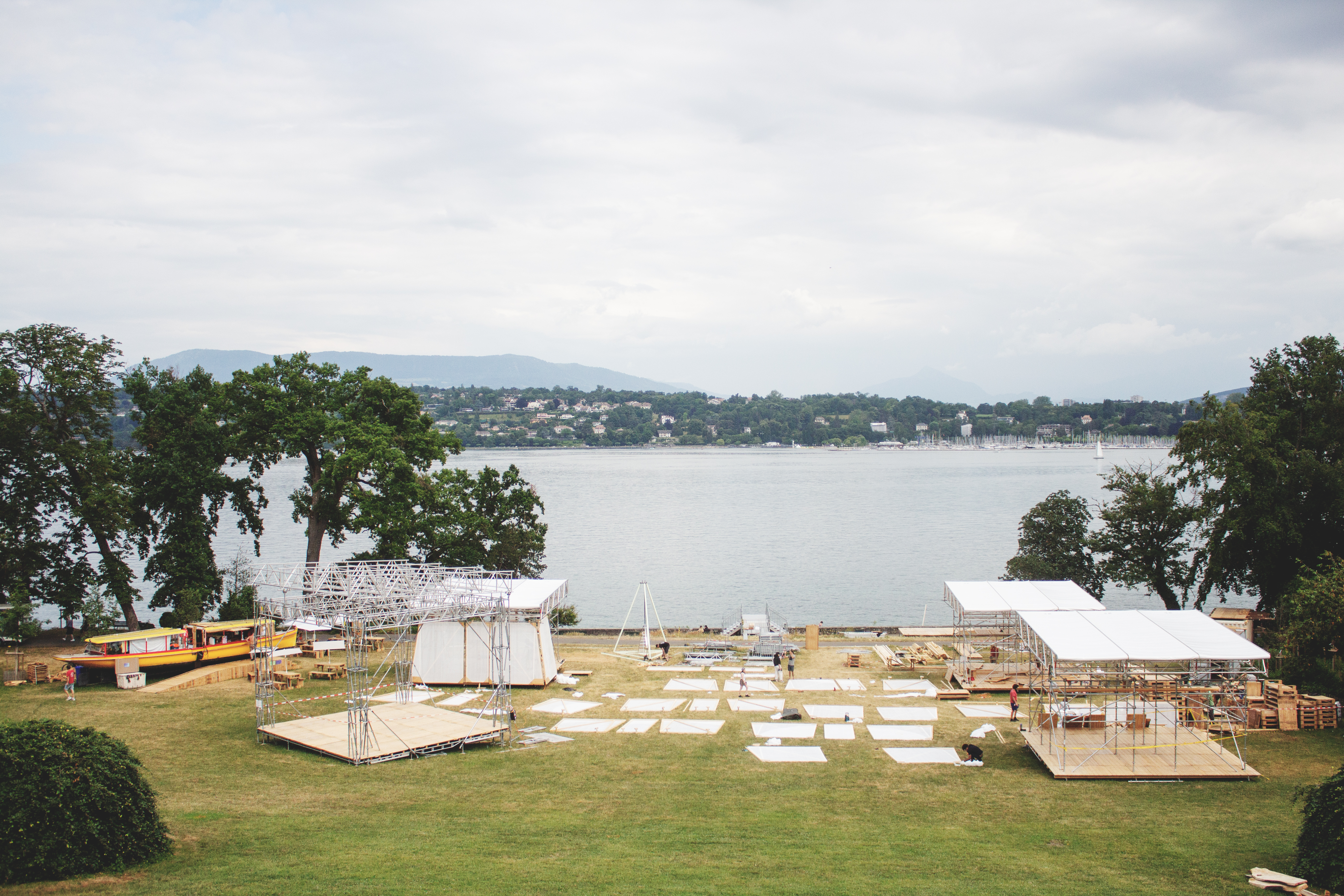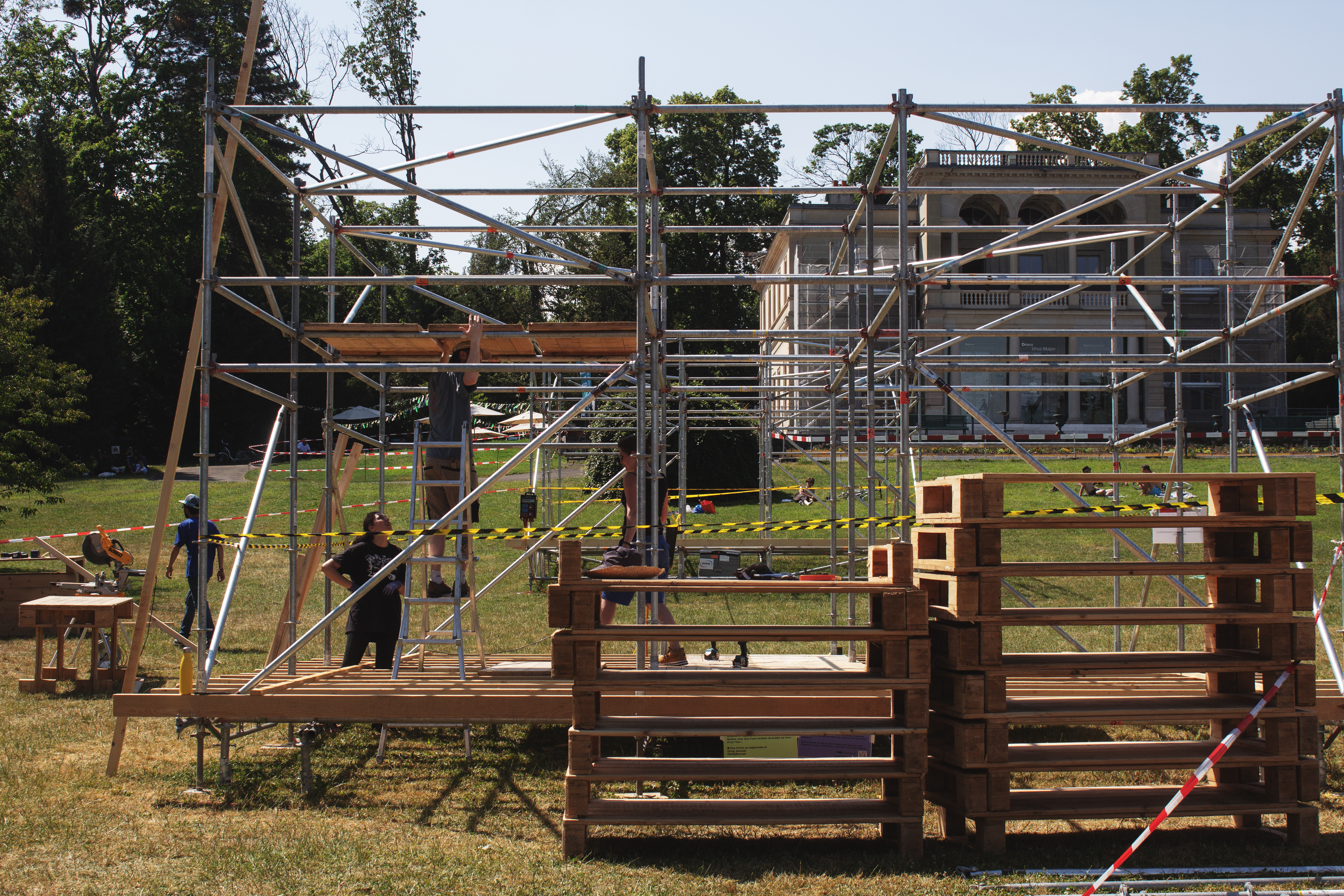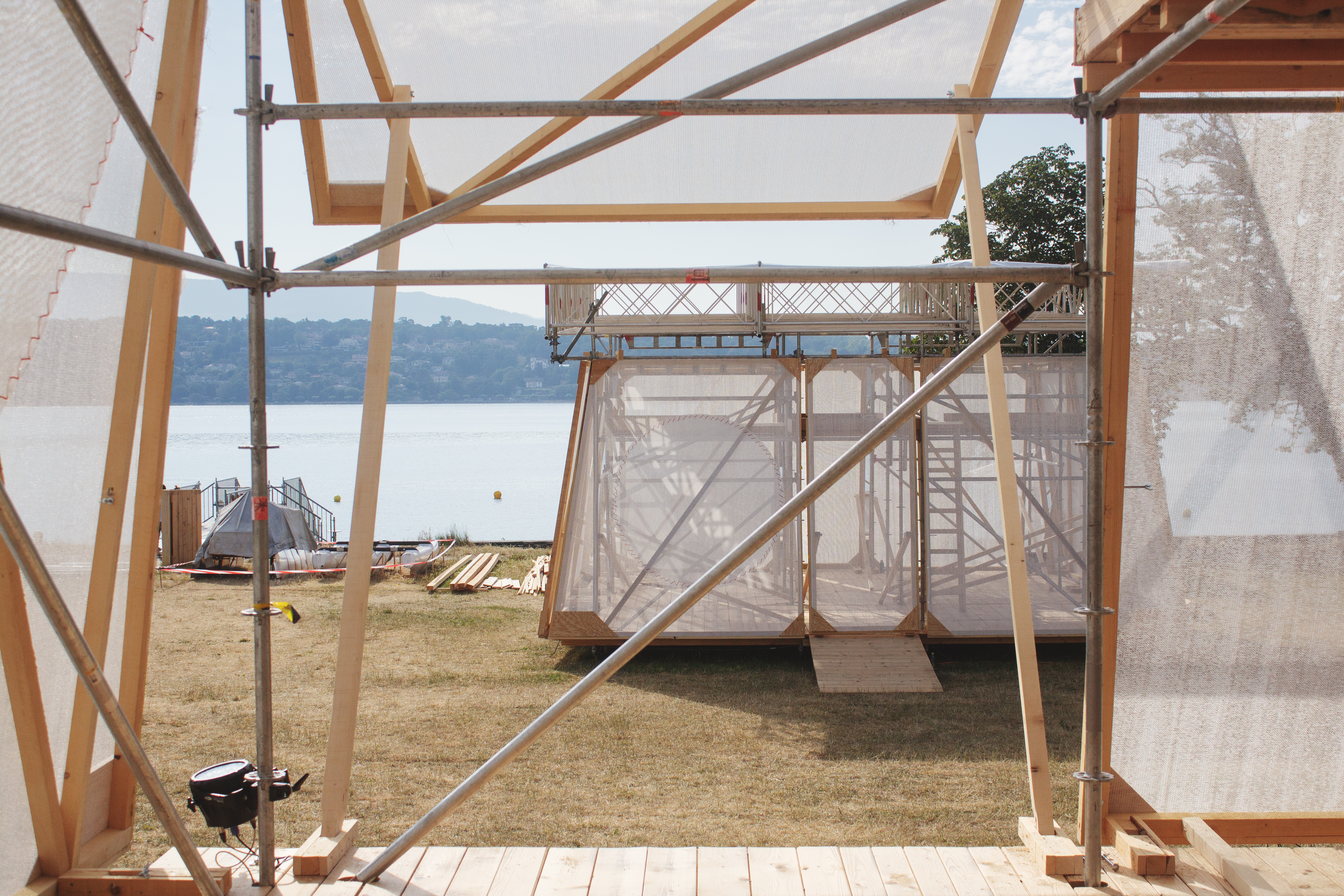 Six semaines de chantier, 17 jours d’événement, une semaine de démontage. Sortie grandie de son expérience inannulable sur l’île Rousseau, la Biennale Insulaire a fait le choix d’incarner le statut de lieu temporaire à la Perle du Lac, devenant le rendez-vous incontournable de l’été pour nombre de genevoisexs. Privilégiant une installation en douceur respectueuse des publics, de l’existant et des structures qui cohabitent tout au long de l’année autour du parc, elle a réitéré le choix d’une infrastructure basée sur le réemploi et privilégié une construction portée de manière horizontale et collective plutôt qu’un chantier pyramidal, fermé aux publics.